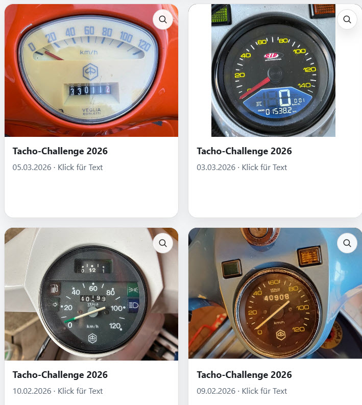 Guten Morgen zusammen, die nächsten Tage bleibt es sonnig und das Thermometer steigt nachmittags bereits auf 18 Grad ... D.h. für uns Luft auffüllen, an beiden Rädern kräftig wackeln, ob auch kein Rad zu großes Spiel hat. Getriebeöl wechseln und unsere Vespa anklicken. Das wäre dann genau der richtige Zeitpunkt ein Foto von euerm Tacho zu machen und das Bild an Robert zu senden. Unsere "Tacho Challenge" hat begonnen und ist auf unserer Homepage zu sehen. Wer am meisten Kilometer in diesem Jahr gefahren ist, bekommt eine Überraschung. Klar ... ! ach da komme ich eh nicht ran - ABER ACHTUNG !!! Wir verlosen auch eine Überraschung unter allen Teilnehmerinnen und Teilnehmern. Also, macht mit ... 🙂