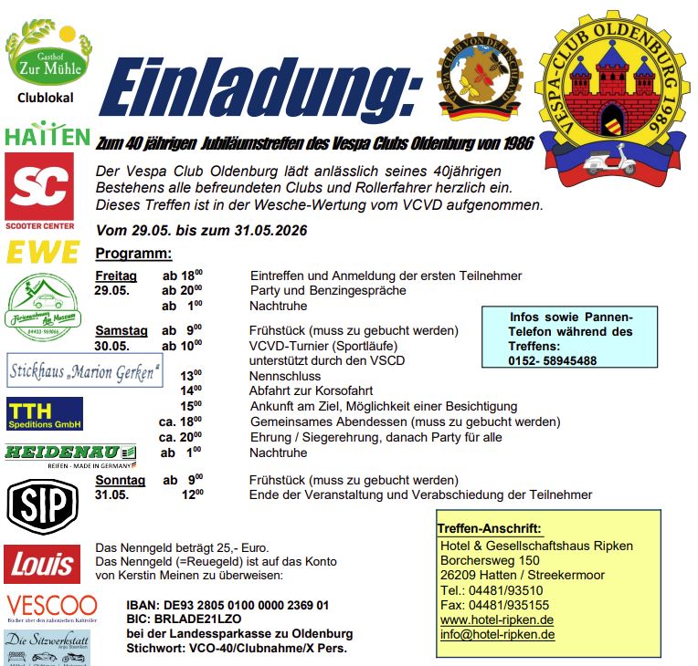 Der Vespa Club Oldenburg lädt anlässlich seines 40jährigen