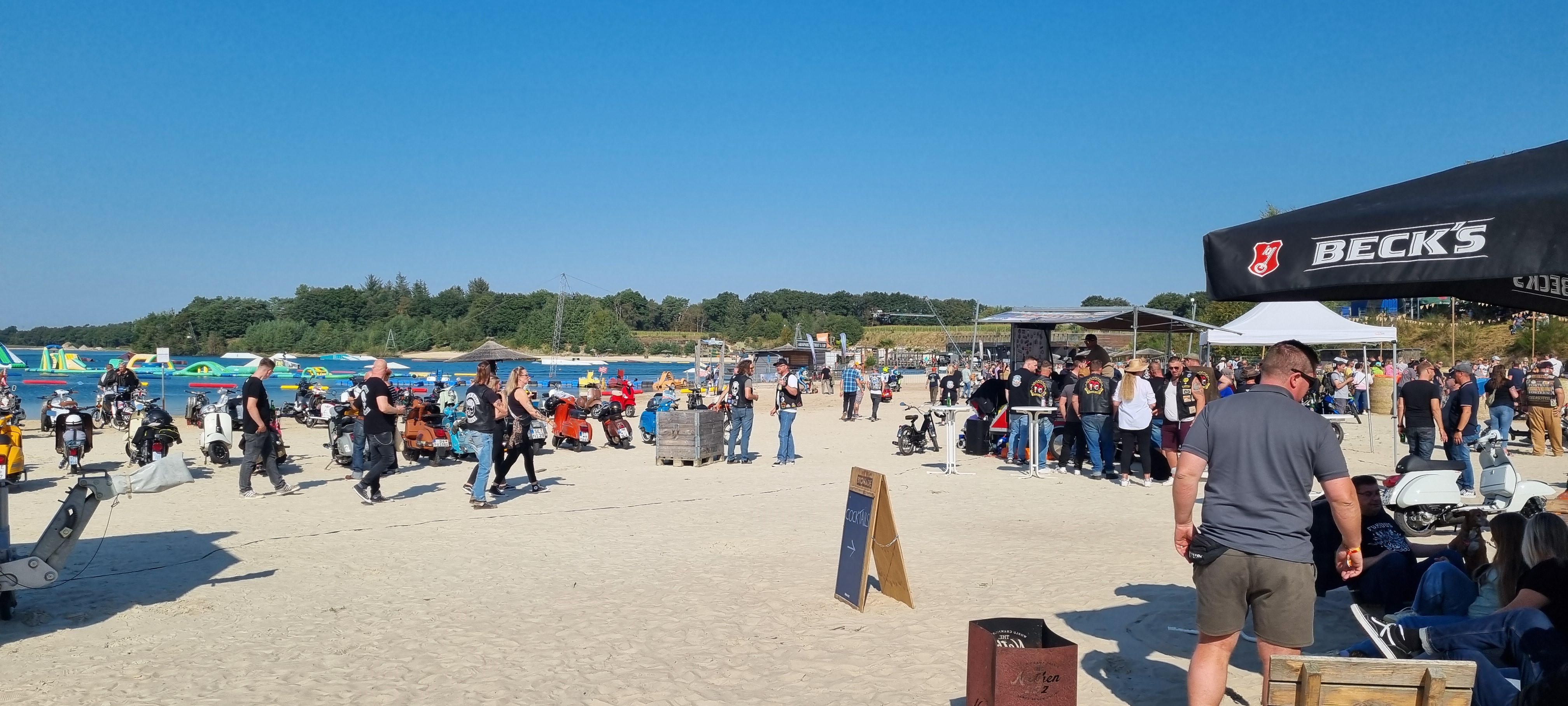 Ich hab mir mein Ticket ja schon im Januar gebucht, sicher ist sicher. Und es gab nix zu bereuen, Jelto hat ein super Ding gezaubert. Das Beachgelände in Nethen ist einmalig, ein bisschen Karibikflair bei uns im Norden. 541 Blechgefährten tummeln sich am Strand, es wurden über 300 Strandplanken ausgegeben. Party-Laune und Benzingespräche mit deutlich zu viel Oktan. So könnte die Überschrift lauten. Ich habe Gäste aus Österreich und den Niederlanden gehen, die Deutschen Kennzeichen kann ich gar nicht zählen. Und für mich vom VSCD war es natürlich ein besonderes Vergnügen, erstmals auch am Strandrennen teilnehmen zu können. Letztes Jahr ist das komplette Ding für mich leider ausgefallen, ein Virus hat mich niedergestreckt. Aber dieses Jahr hatte mich der Vespa-Virus wieder fest im Griff! Also Anreise am Freitag und ab auf den Campingplatz. Vespa aus dem T4 und erst mal ab an den Strand, Probefahrt quasi. War schon gut was los, toll zu Fahrt aufnehmen.